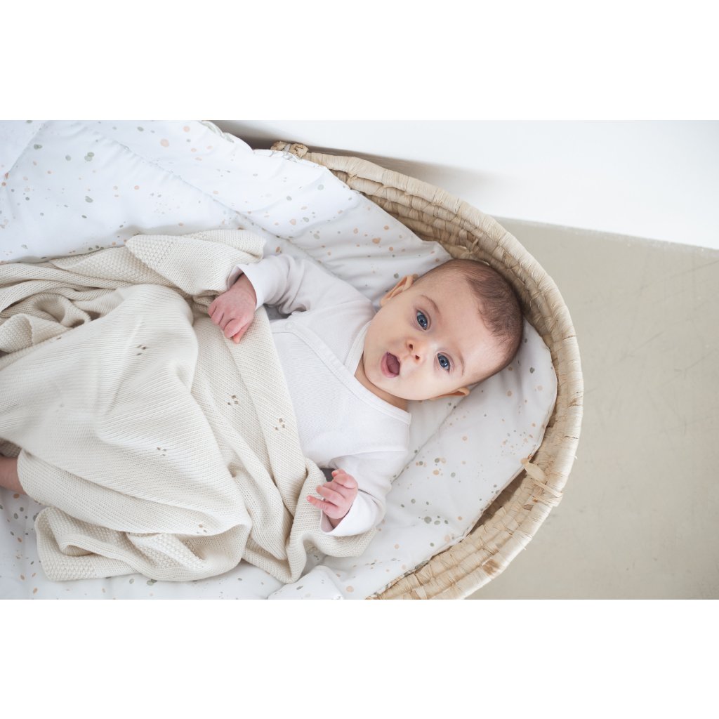Kocyk jest bardzo przyjemny w dotyku, idealny na letnie dni. Dzięki swojemu splotowi jest przewiewny, odprowadza wilgoć i jednocześnie chroni dziecko przed promieniami słonecznymi. Doskonale pasuje do każdego wózka, łóżeczka, fotelika samochodowego. Kolory są bardzo delikatne i harmonizują z każdym wnętrzem.