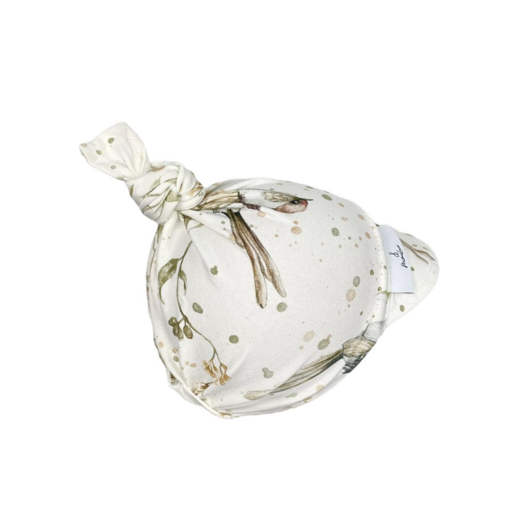 Bavlněný dětský šátek s kšiltem 6-18m. Golden Birds White