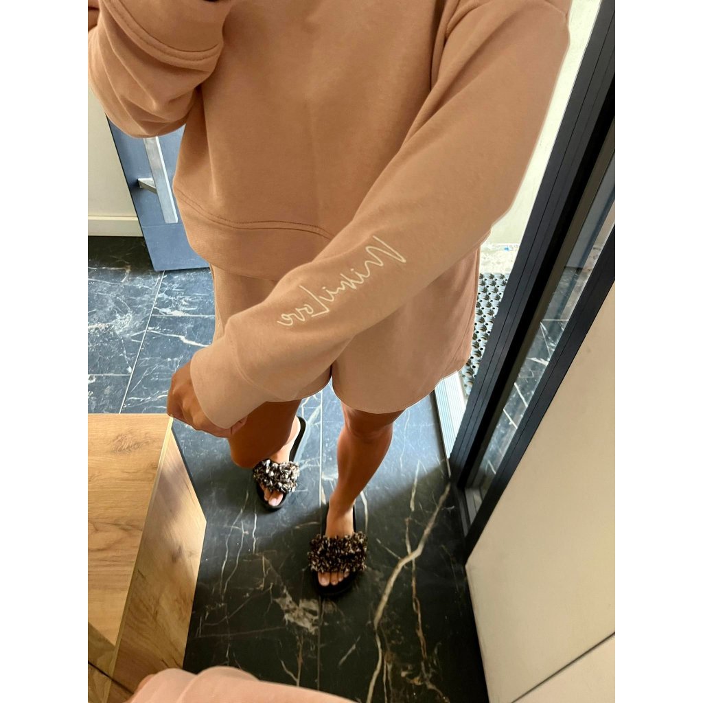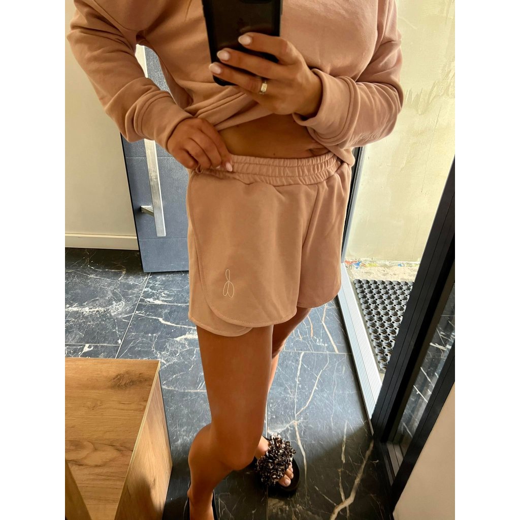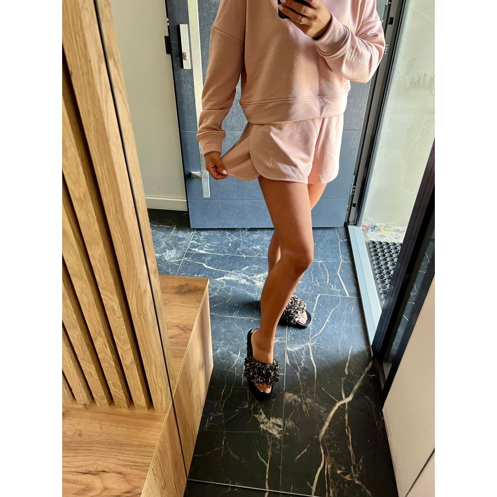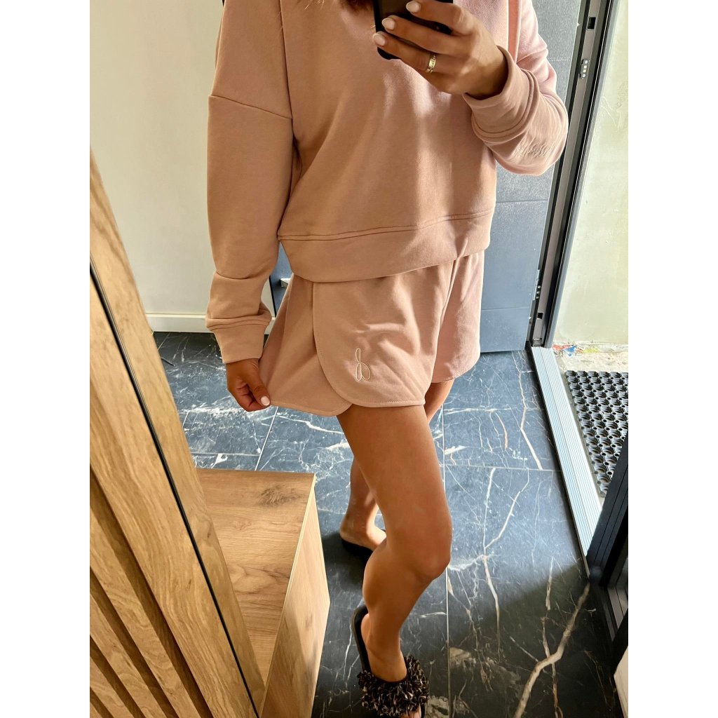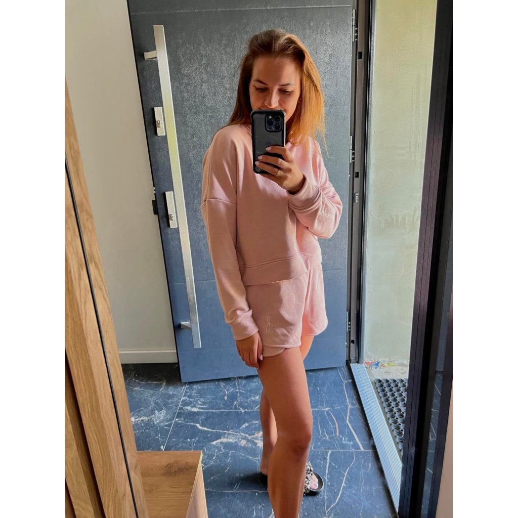 Souprava obsahuje mikinu a kraťasy. Tyto kousky lze kombinovat s kterýmkoliv kousek oblečení! Vše je vyrobeno z velmi příjemného materiálu. Souprava je v módních pastelových barvách! Mikina má na konci rukávu vyšito logo naší značky, vypadá to velice luxusně a kraťasy na jedné nohavici vyšitou znak loga.