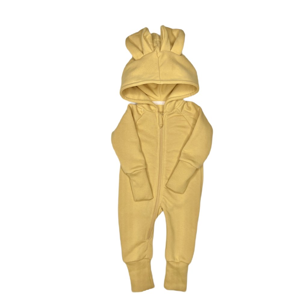 Velice praktický overal s kapucí a roztomilými oušky medvídka, vyrobeno z velmi příjemného a teplého bavlněného materiálu. Dítě se v něm cítí příjemně.