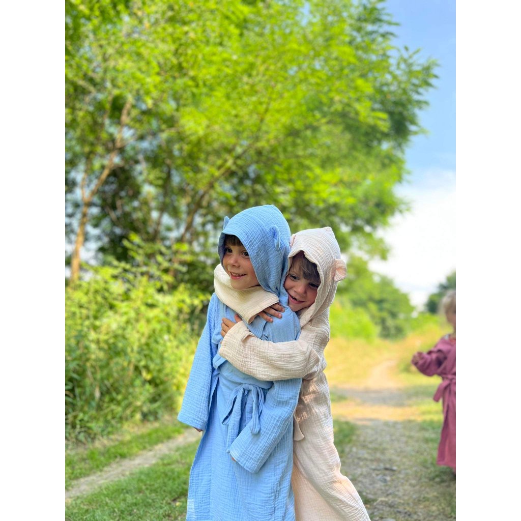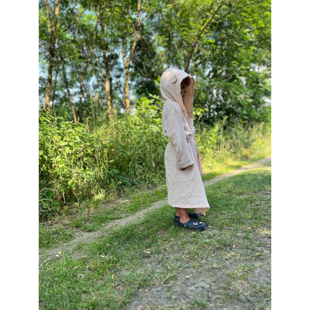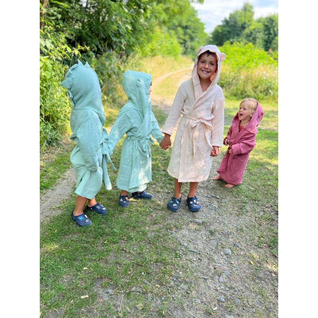 Tento dětský župánek s kapucí je vyrobený z velmi příjemného bavlněného mušelínu. Vaše děti budou mít pocit sucha a tepla i po osušení po koupání. Bude skvělým doplňkem pro každodenní rituály po koupání a pro relaxaci doma. Vaše děti se budou cítit pohodlně a stylově s roztomilými doplňky na kapuci.