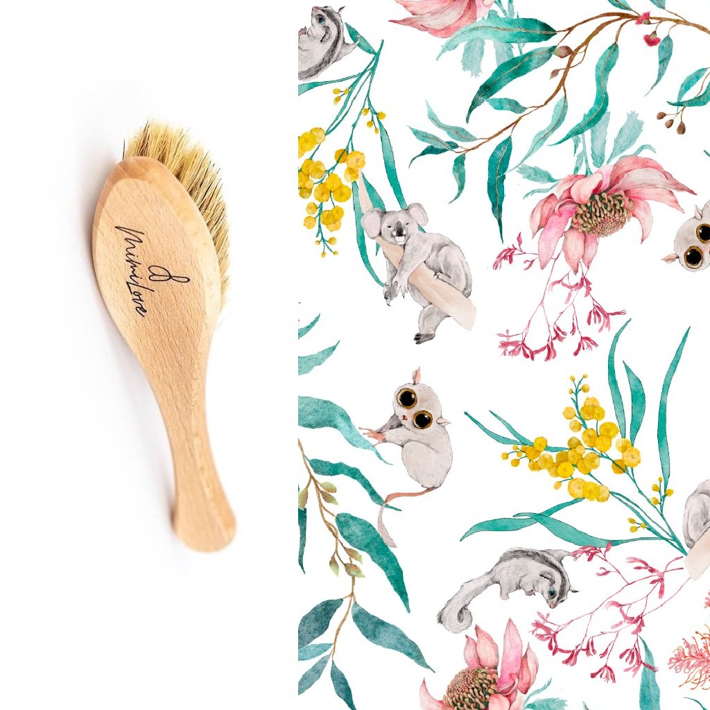 Kartáč na vlásky pro novorozence vyroben z bukového dřeva a kozích vlasů, doplněn o praktickou plenku.