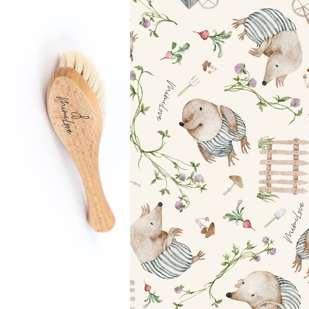 Kartáč na vlásky pro novorozence vyroben z bukového dřeva a kozích vlasů, doplněn o praktickou plenku.