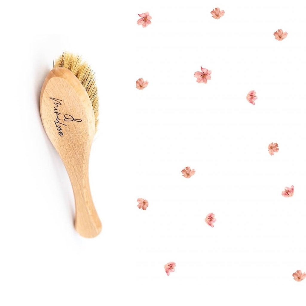 Kartáč na vlásky pro novorozence vyroben z bukového dřeva a kozích vlasů, doplněn o praktickou plenku.