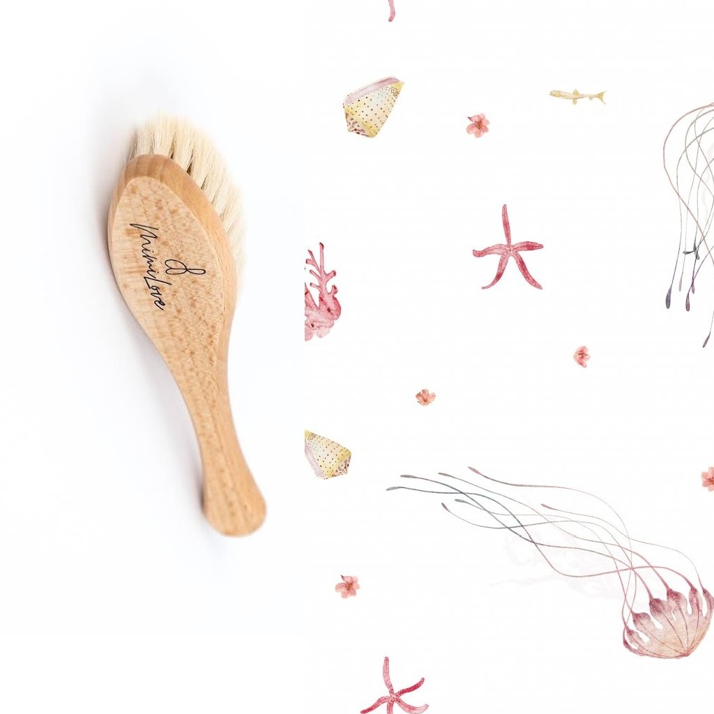Kartáč na vlásky pro novorozence vyroben z bukového dřeva a kozích vlasů, doplněn o praktickou plenku.