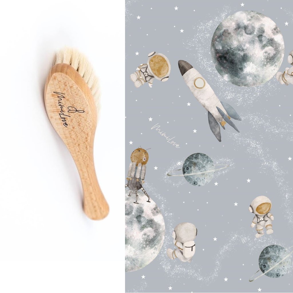 Kartáč na vlásky pro novorozence vyroben z bukového dřeva a kozích vlasů, doplněn o praktickou plenku.