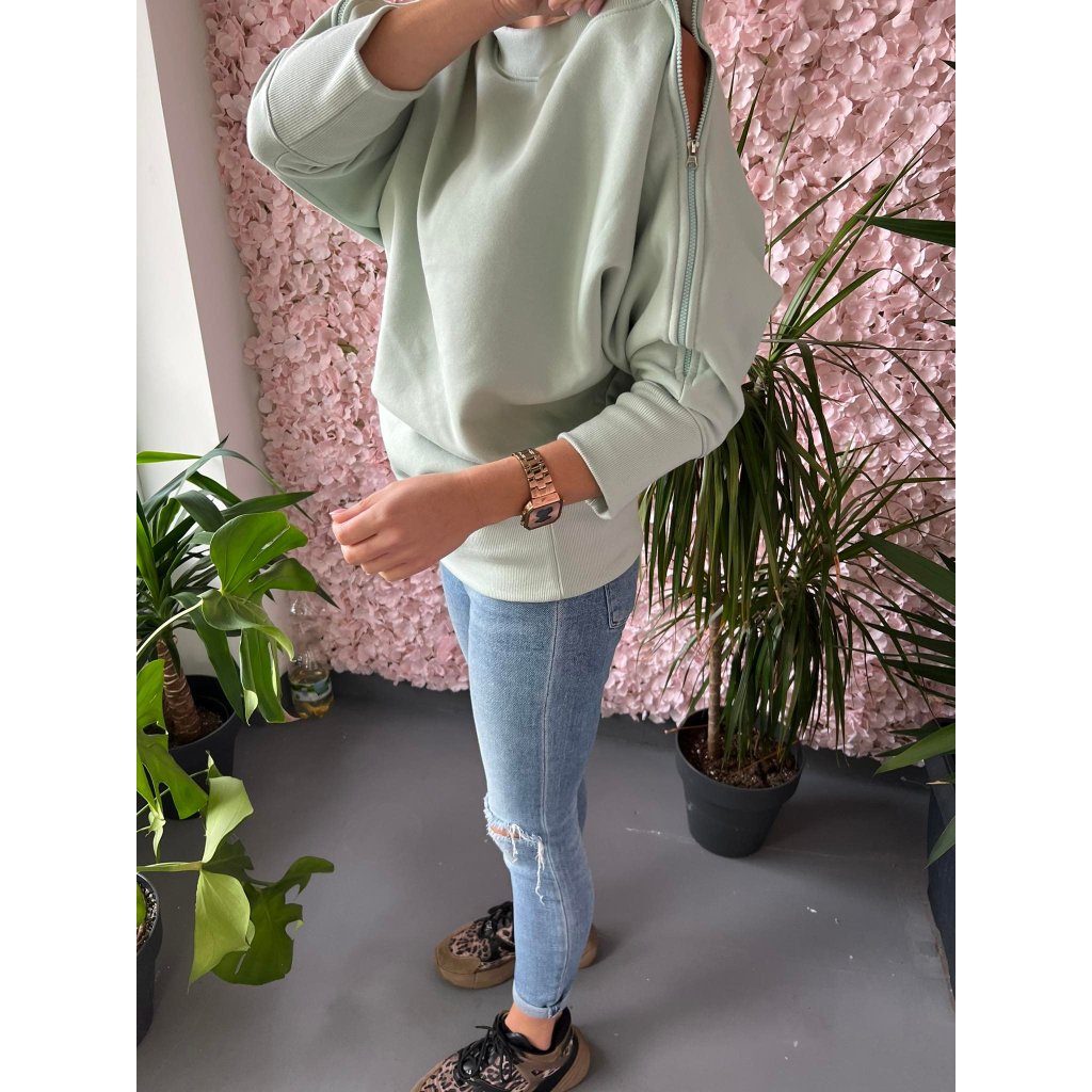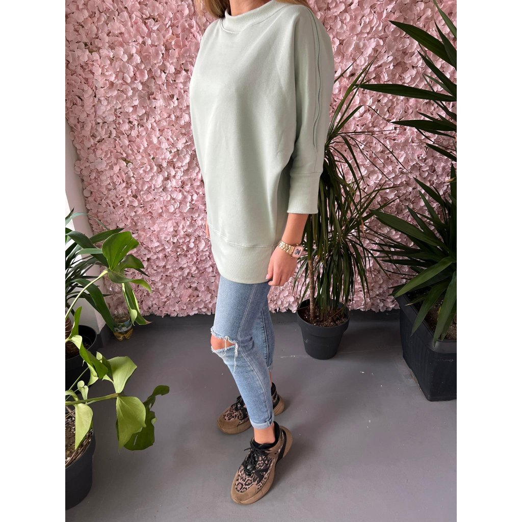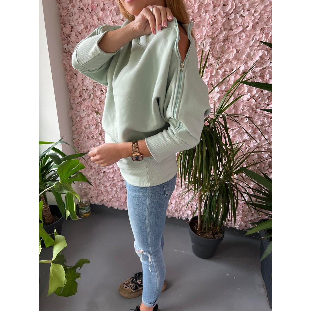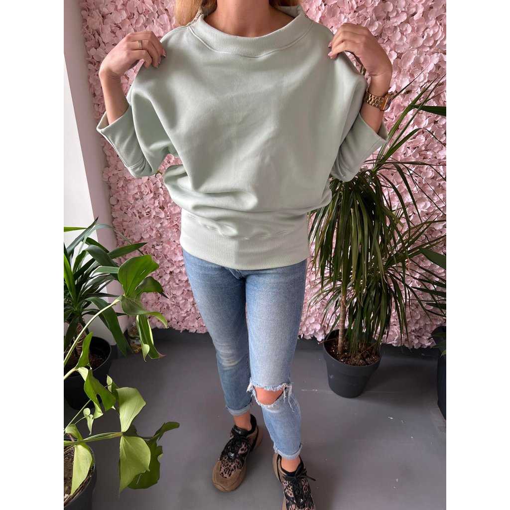 Mikina má mírné netopýří 3/4 rukávy, zakončené delší manžetou. Spodní lem je široký a pružný, proto mikinu lze nosit jako k džínám, tak jako dlouhou k legínám.