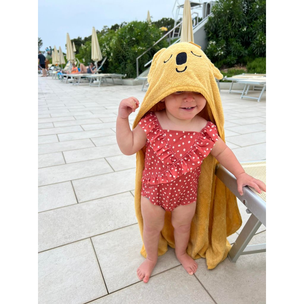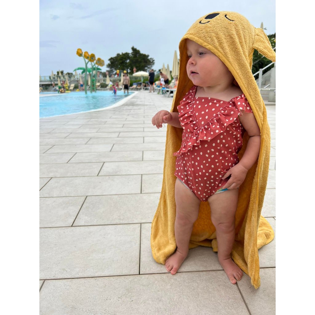 Ideální doplněk na dovolenou, kde chrání dítě před sluníčkem. Osuška je vyrobena z kvalitního bambusového froté, krásně saje a velmi příjemná na dotek.