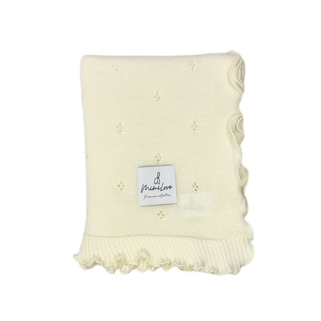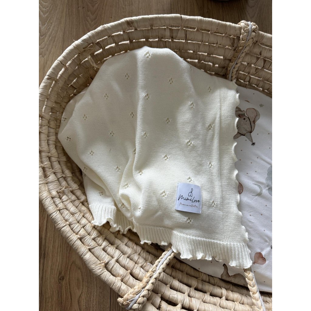 Lehká dečka z Merino vlny v krásném úpletu, zdobená volánkem, kolem celého úplet dečky, je pružná, lehoučká a zároveň je obdarována skvělými vlastnostmi. Dítě se pod dečkou nepotí, krásně odvádí vlhkost a zároveň hřeje.