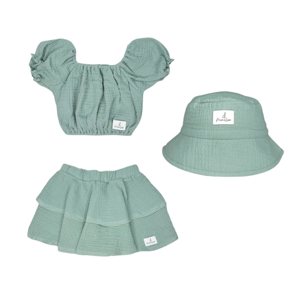 Letní mušelínová sukýnková souprava s KLOBOUČKEM vel. 4-7 let Šalvěj