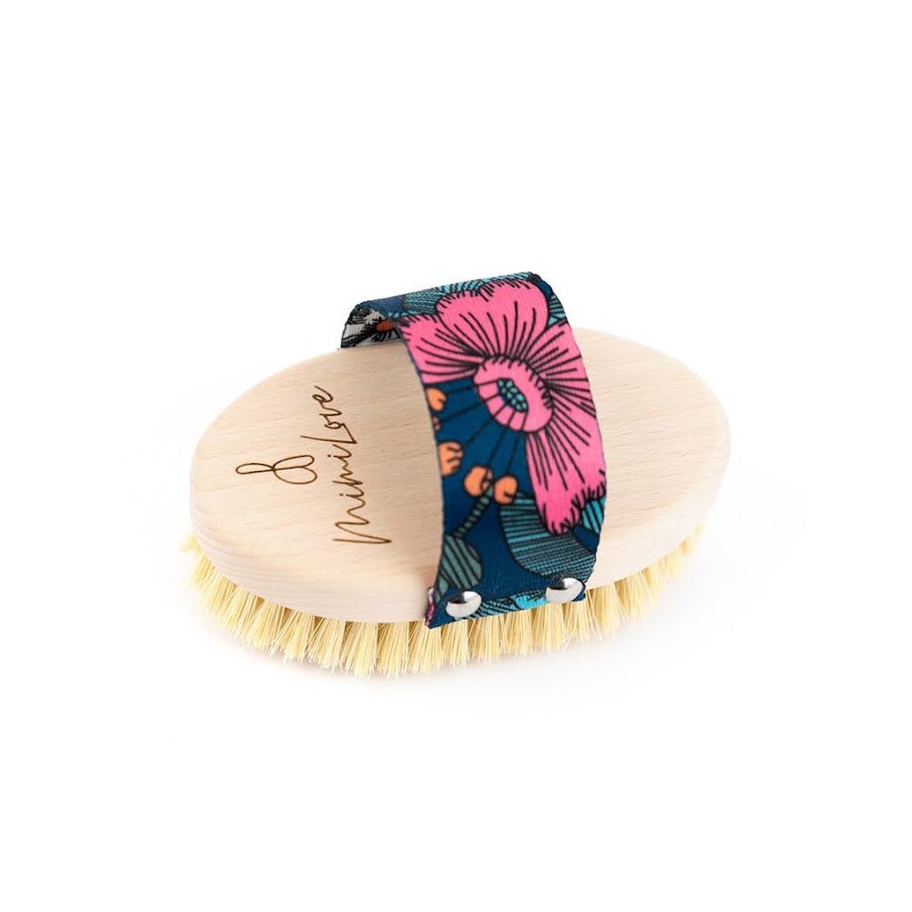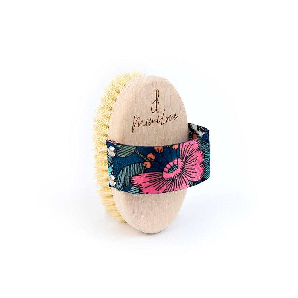 Masážní kartáč vyroben z bukového dřeva a štětin z agáve zdobený originálním praktickým páskem.