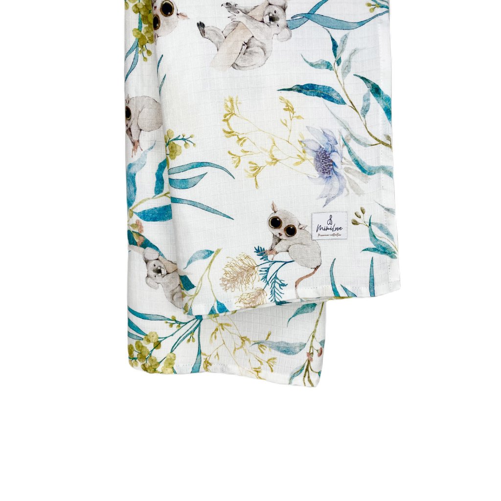 Praktická velká zavinovací přikrývka z velmi příjemného mušelínu v praktickém vzoru Australian Summer ve velikosti