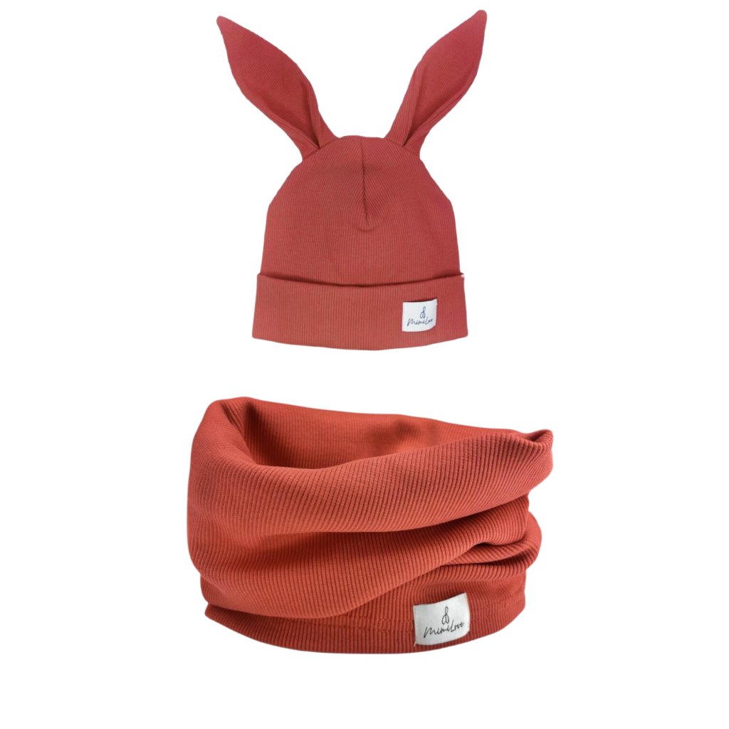 Sada čepičky KRÁLÍČEK s nákrčníkem Cihlově červená 06-24m.