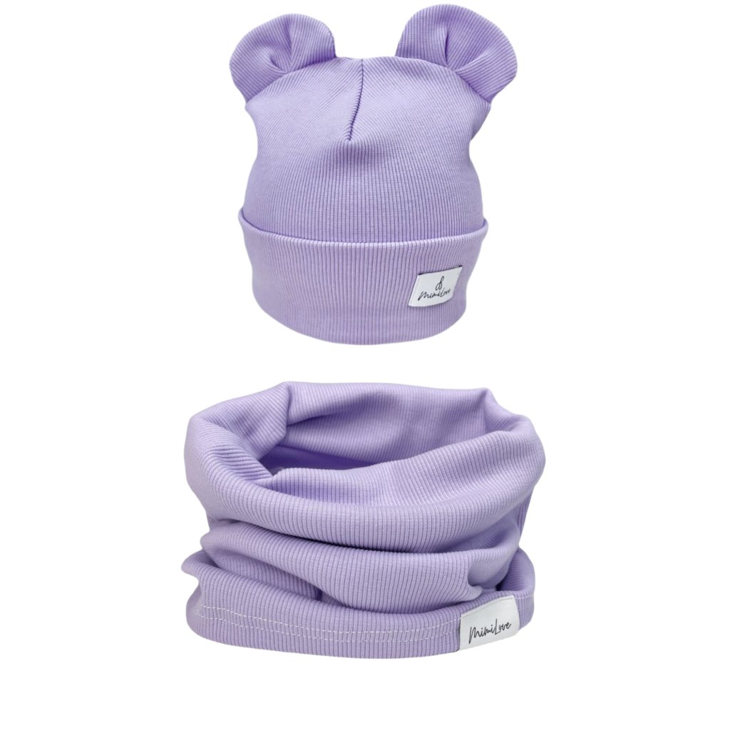 Sada čepičky MEDVÍDEK s nákrčníkem Levandule 06-24m.