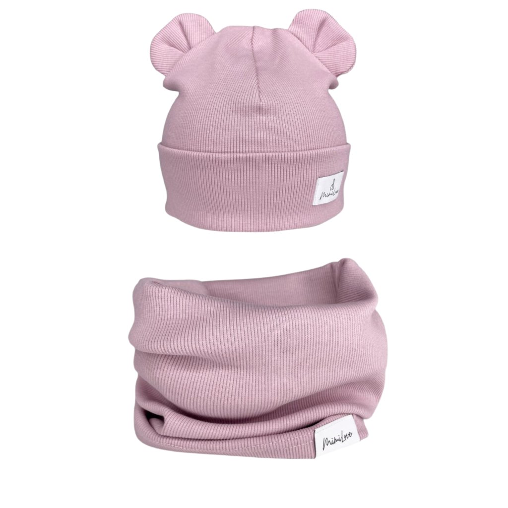 Souprava čepičky s oušky a nákrčníkem, vyrobena z velmi příjemného materiálu v žebrovaném úpletu.