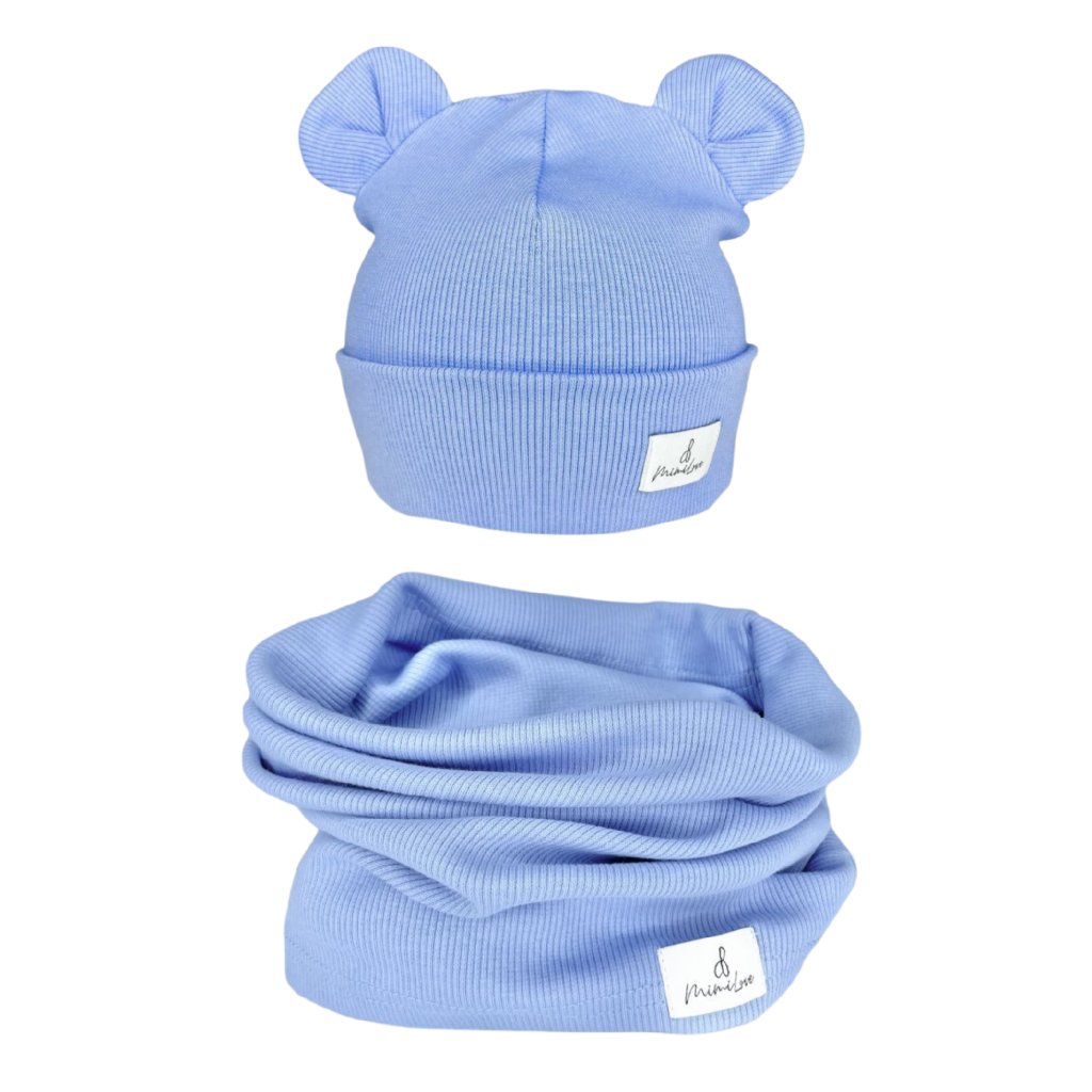 Souprava čepičky s oušky a nákrčníkem, vyrobena z velmi příjemného materiálu v žebrovaném úpletu.