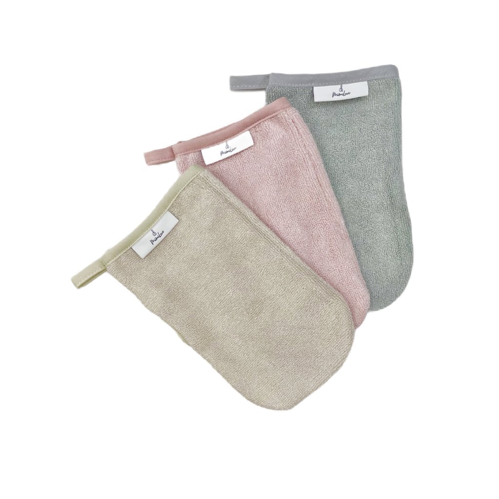 Sada obsahuje tři mycí žínky ve třech barvách: růžová, béžová a šedá