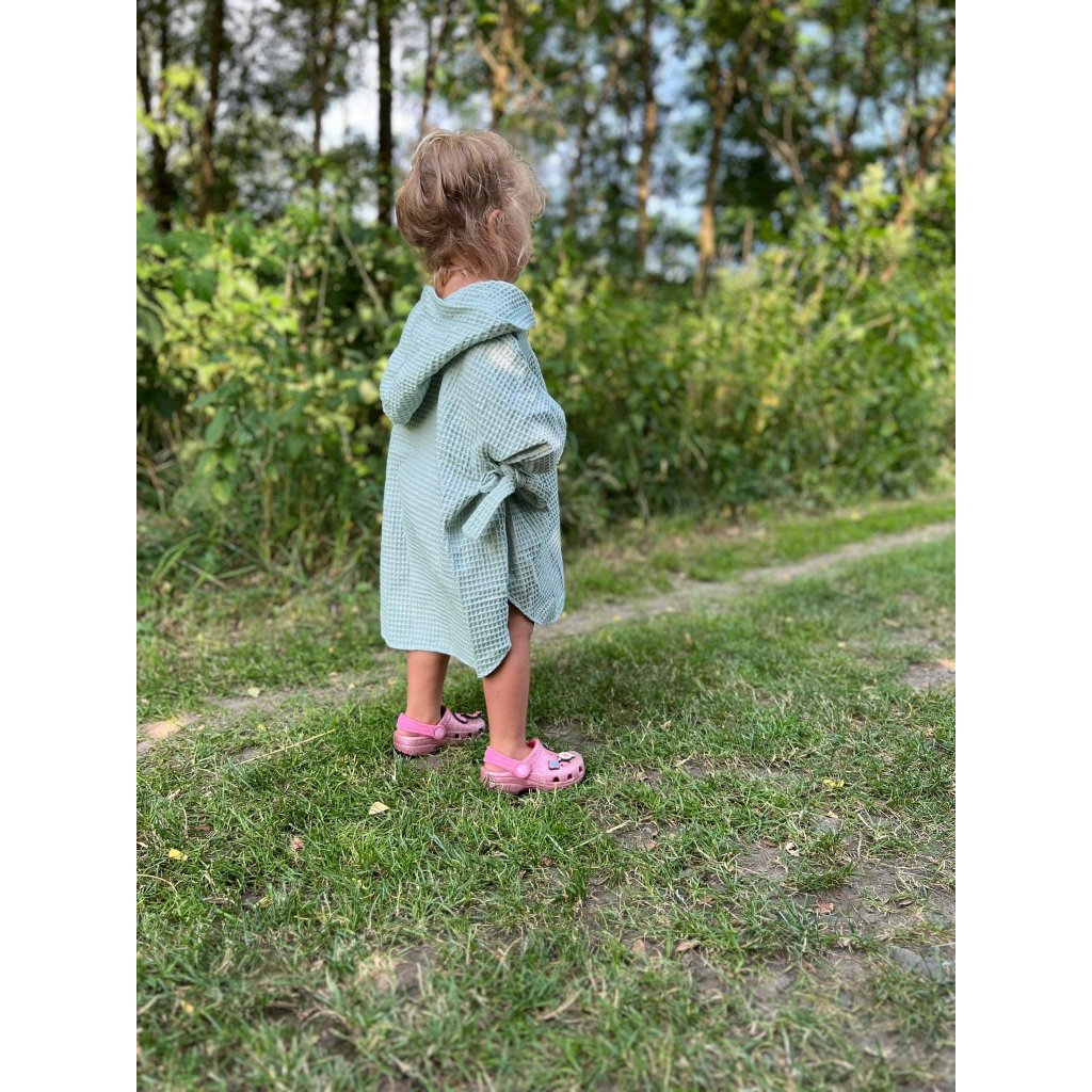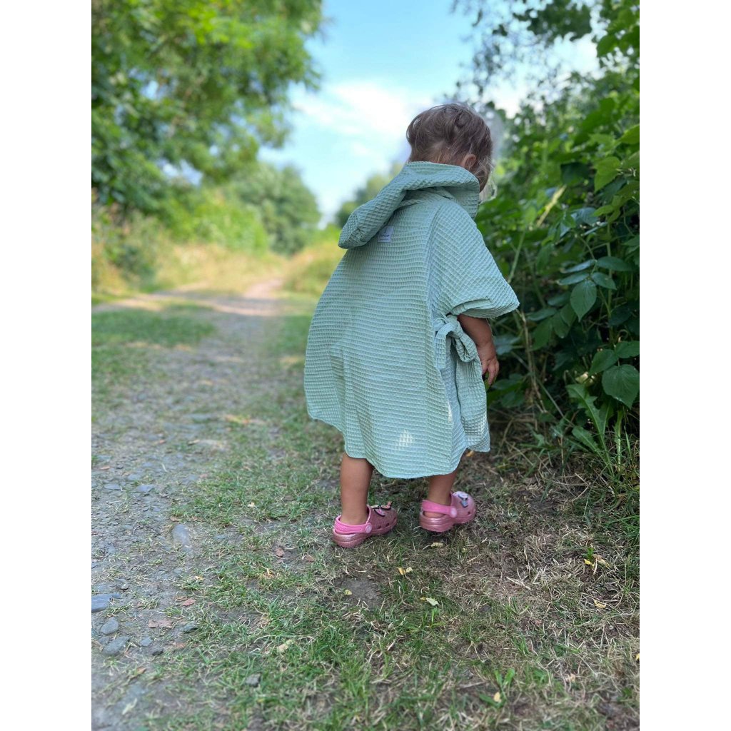 Praktické a zároveň velmi roztomilé dětské pončo z příjemné tkaniny ve vzoru vaflí. Na bocích má dva pásky, které snadno zavážete. Je to praktické při oblékání dítěte.