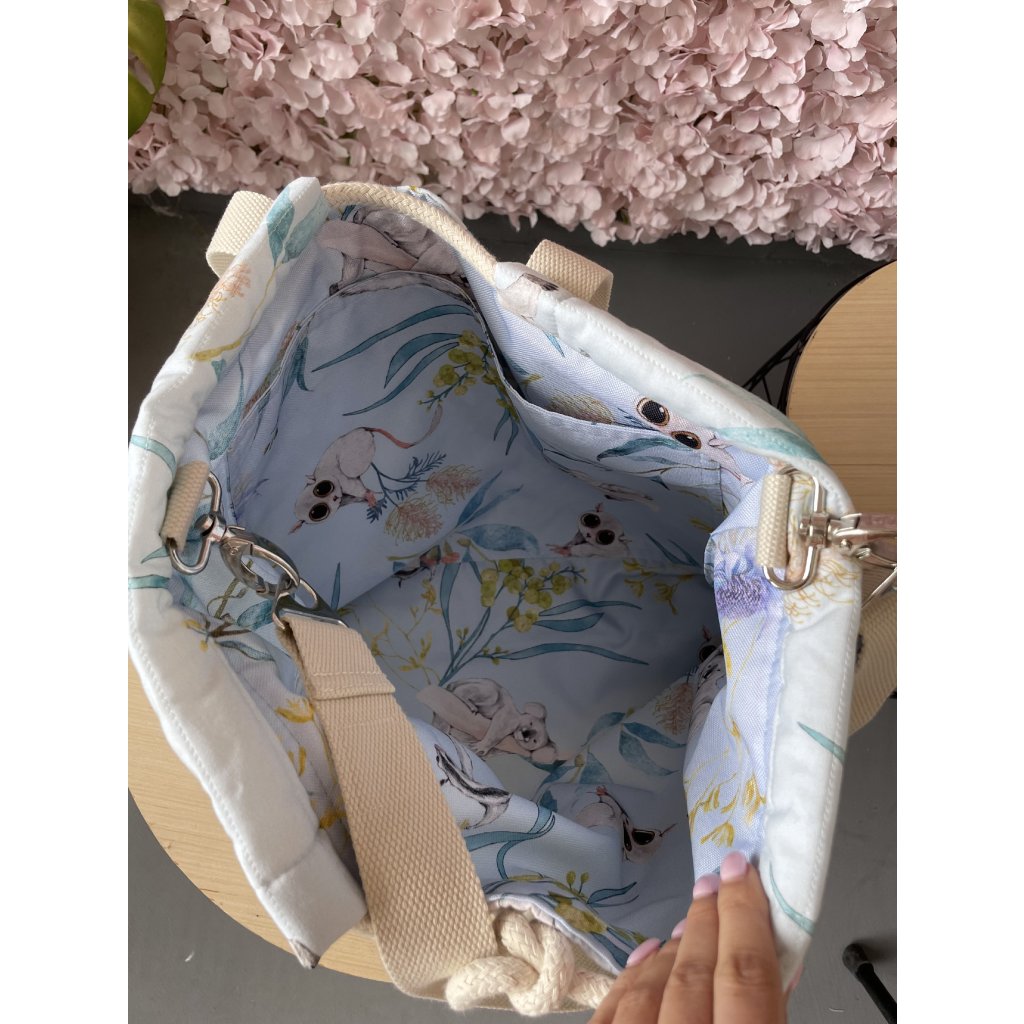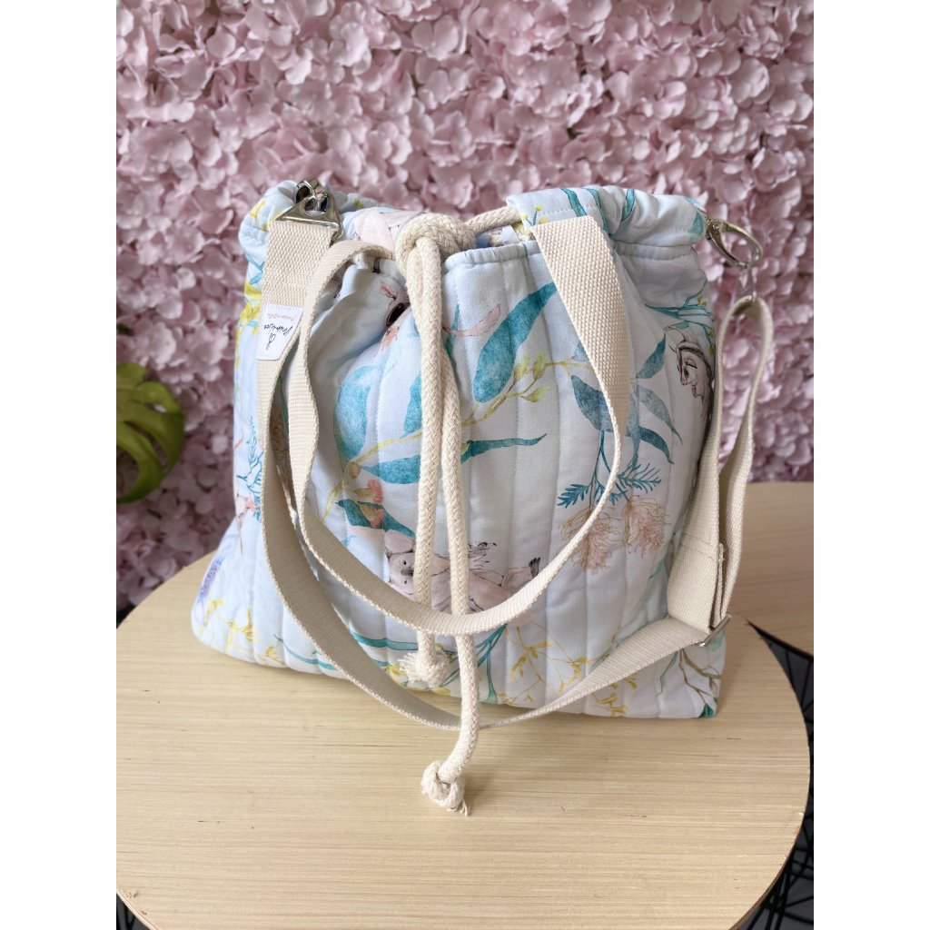 Taška je vyrobena z bavlněného materiálu a uvnitř je nepromokavý materiál ve stejném vzoru, který zaručuje voděodolnost a snadnou údržbu. Stačí vždy otřít vlhkým hadříkem. Taška má dvě kratší pevná ucha a jeden nastavitelný dlouhý popruh, kterým lze taška nosit přes rameno, uzavírání je řešeno stažením pásku.