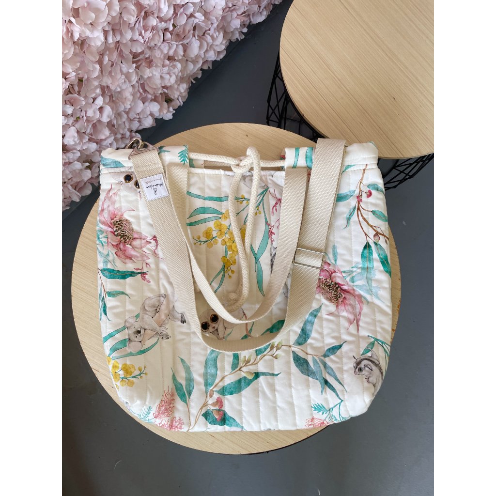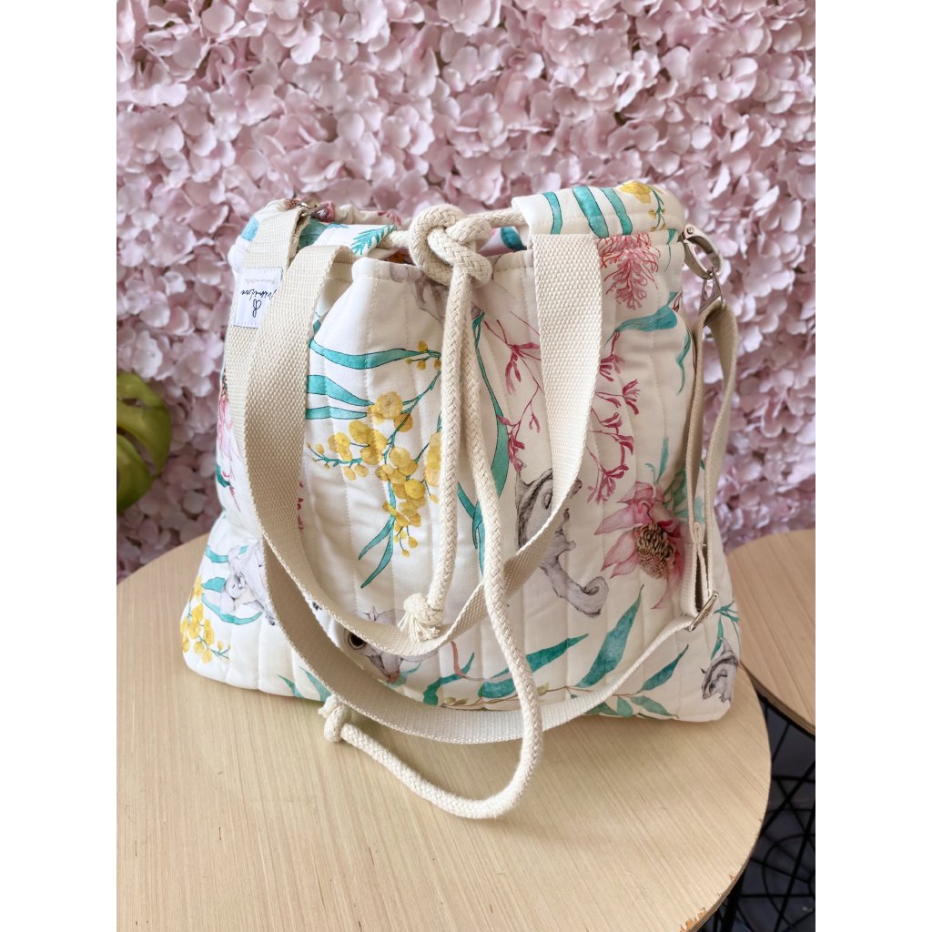 Taška je vyrobena z bavlněného materiálu a uvnitř je nepromokavý materiál ve stejném vzoru, který zaručuje voděodolnost a snadnou údržbu. Stačí vždy otřít vlhkým hadříkem. Taška má dvě kratší pevná ucha a jeden nastavitelný dlouhý popruh, kterým lze taška nosit přes rameno, uzavírání je řešeno stažením pásku.