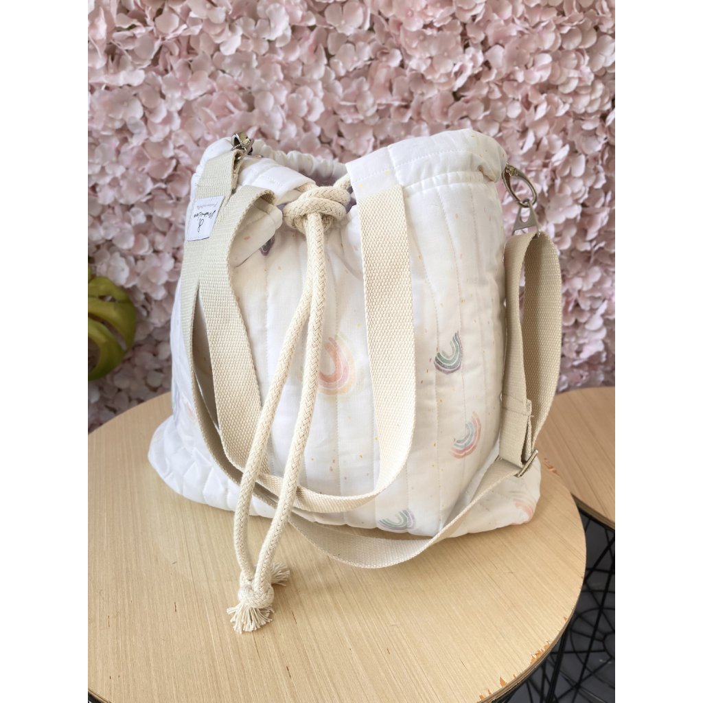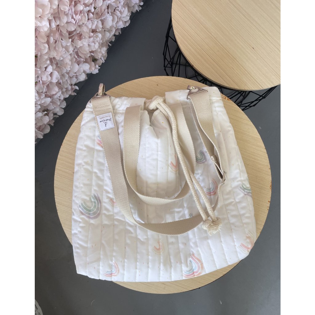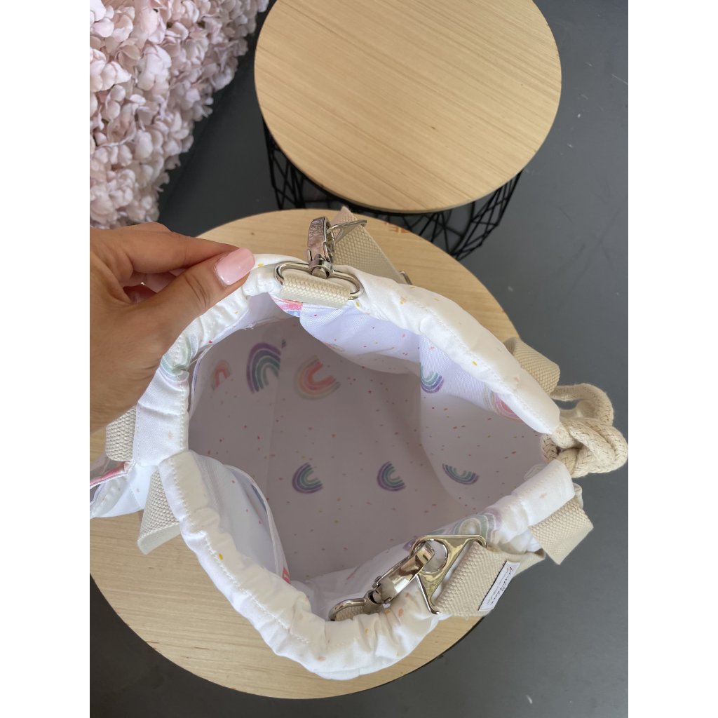 Taška je vyrobena z bavlněného materiálu a uvnitř je nepromokavý materiál ve stejném vzoru, který zaručuje voděodolnost a snadnou údržbu. Stačí vždy otřít vlhkým hadříkem. Taška má dvě kratší pevná ucha a jeden nastavitelný dlouhý popruh, kterým lze taška nosit přes rameno, uzavírání je řešeno stažením pásku.