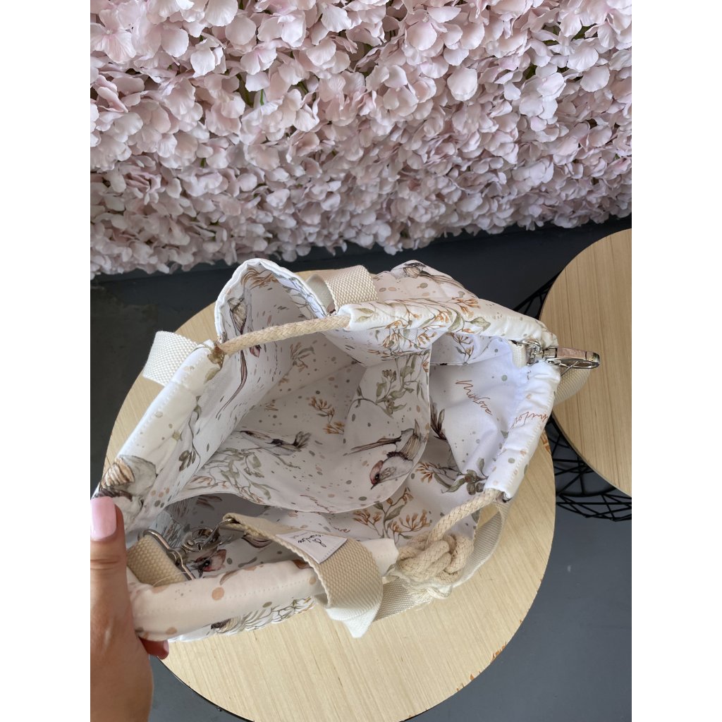 Taška je vyrobena z bavlněného materiálu a uvnitř je nepromokavý materiál ve stejném vzoru, který zaručuje voděodolnost a snadnou údržbu. Stačí vždy otřít vlhkým hadříkem. Taška má dvě kratší pevná ucha a jeden nastavitelný dlouhý popruh, kterým lze taška nosit přes rameno, uzavírání je řešeno stažením pásku.