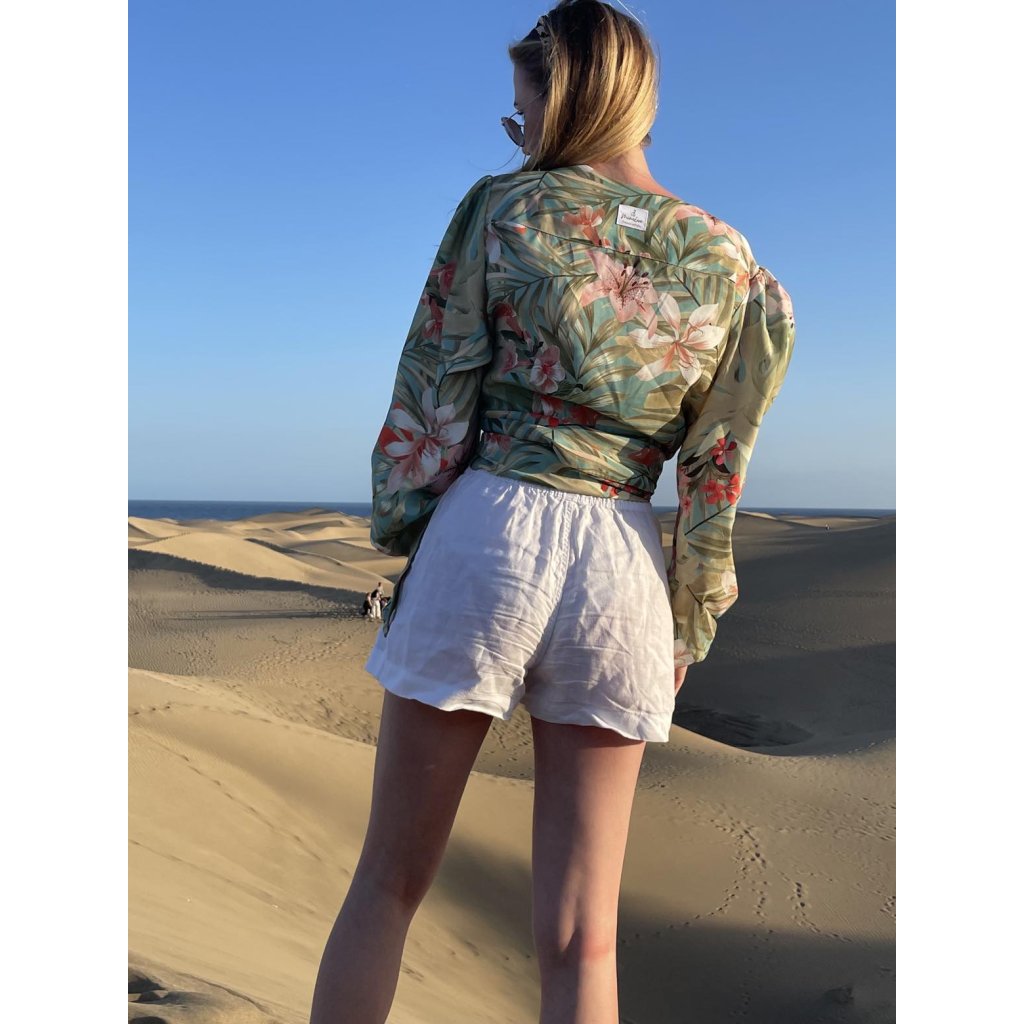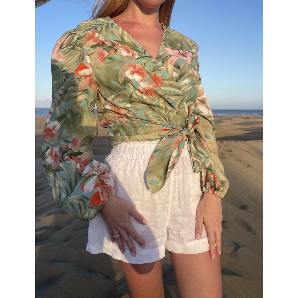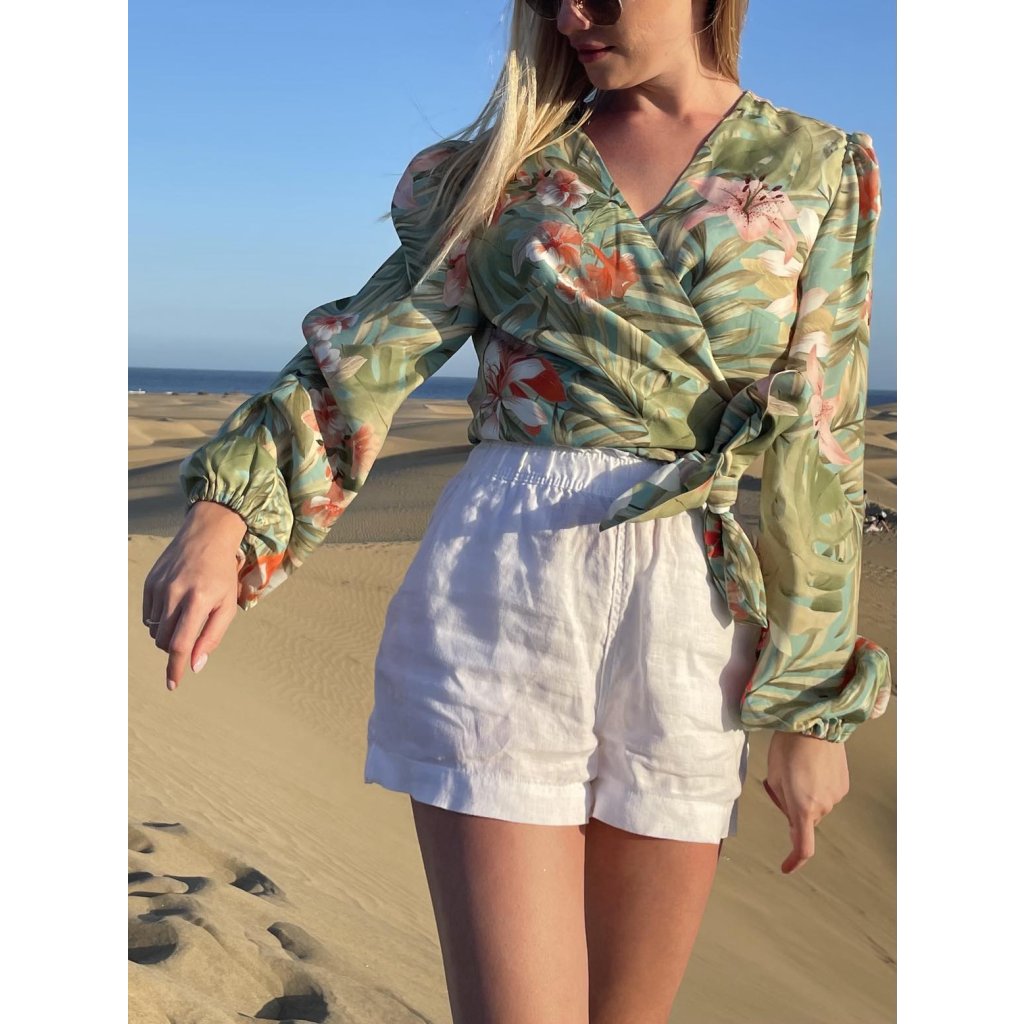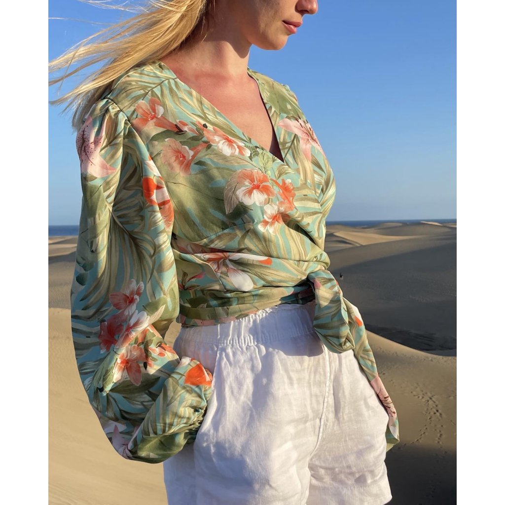 Zavinovací halenka s dlouhým rukávem v letním vzoru květin se váže na boku, nebo můžete uvázat zezadu jako mašle.